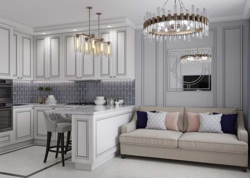Оформить кухню-гостиную можно в классическом стиле. Деревянная мебель молочного цвета, текстильные обои, старинные орнаменты, хрустальная люстра — ключевые детали классики в дизайне на этом примере. Каждая вещица выглядит как предмет искусства, но в то же время использовать по назначению ту или иную мебель не кажется невозможным. Сдержанный и в то же время изысканный интерьер идеально подходит для маленьких помещений.