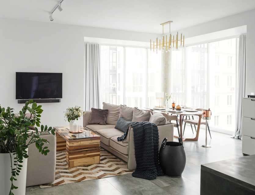 Казалось бы, помещение включает массу предметов, которые способны загромоздить комнату и отнять площадь, необходимую для комфорта. Но в действительности все это легко размещается эргономично и компактно. Для функционального и располагающего интерьера следует отказаться от элементов, которые фактически находятся у вас на пути при пересечении комнаты. Например, это могут быть крупные вазы в классическом стиле. Их лучше убрать в ниши. Аналогично можно поступить с телевизором, полками вместо традиционной стенки.