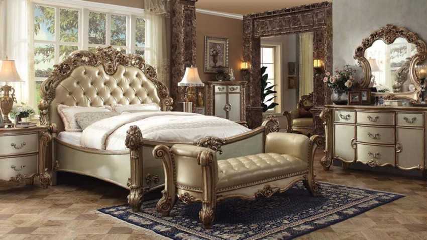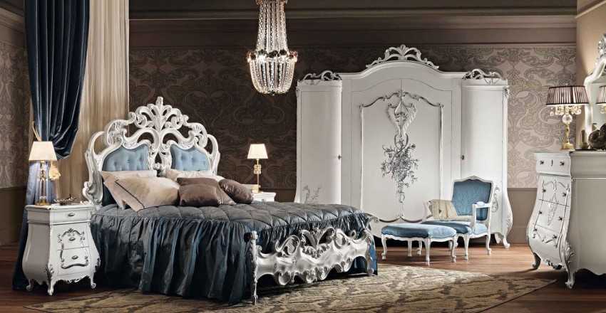 Кроме кровати в спальне ставятся кресла для отдыха, маленький столик, предназначенный для мелочей, банкетки и настольные лампы. Следует избегать перебора позолоты или металла