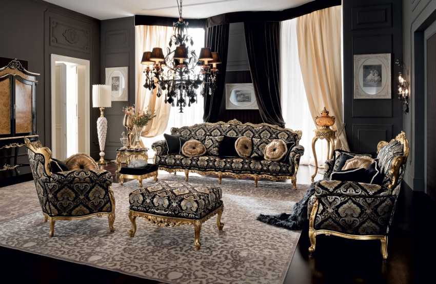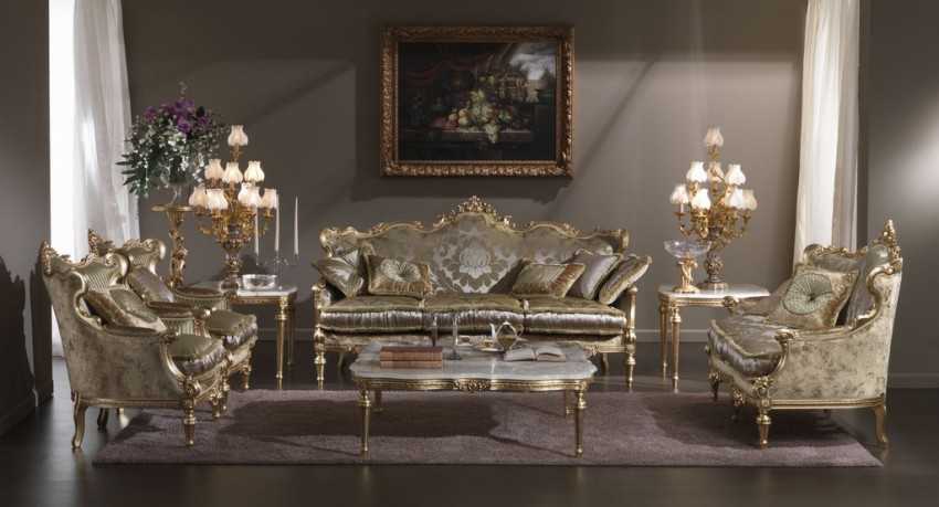Как правило, в гостиной располагаются стенка или шкаф, комод, журнальный столик, кожаный диван или диван с натуральной тканевой обивкой, например, гобеленом. Часто встречаются парные кресла.