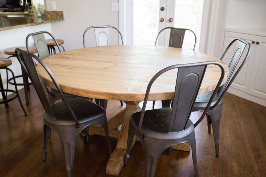 Круглые столы подходят для больших кухонь и гостиных, их располагают в центре помещения. Основная проблема, что они занимают больше пространства. Их не приставишь к стене, так как для того, чтобы сесть за круглый стол, нужно свободное пространство. Круглая форма столешницы дает возможность варьировать количеством ножек: их может быть одна, две, три или четыре. Вариант с двумя ножками не подходит, так как такая конструкция не устойчива. Можно установить круглый столик и в небольшой кухне, тогда столешница должна быть не более 90 см.