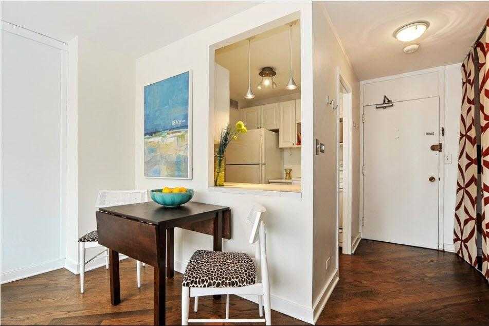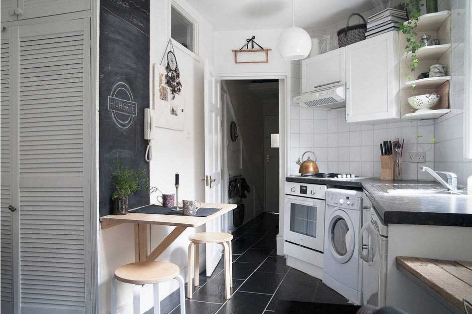 Раскладывающийся обеденный стол, закрепленный на стене, имеет нишу в стене, куда прячется за ненадобностью. Компактное размещение кухонной мебели выполняет сразу несколько функций, что ценно для малогабаритной кухни