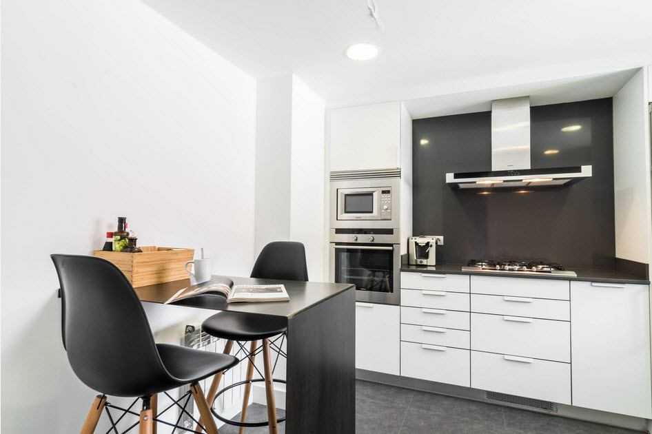 Ещё один вариант можно использовать даже для очень маленькой кухни. Речь о выдвигающейся из гарнитура дощечке. Она без ножек и полностью не вынимается, а сидеть за ней могут двое – не более.
