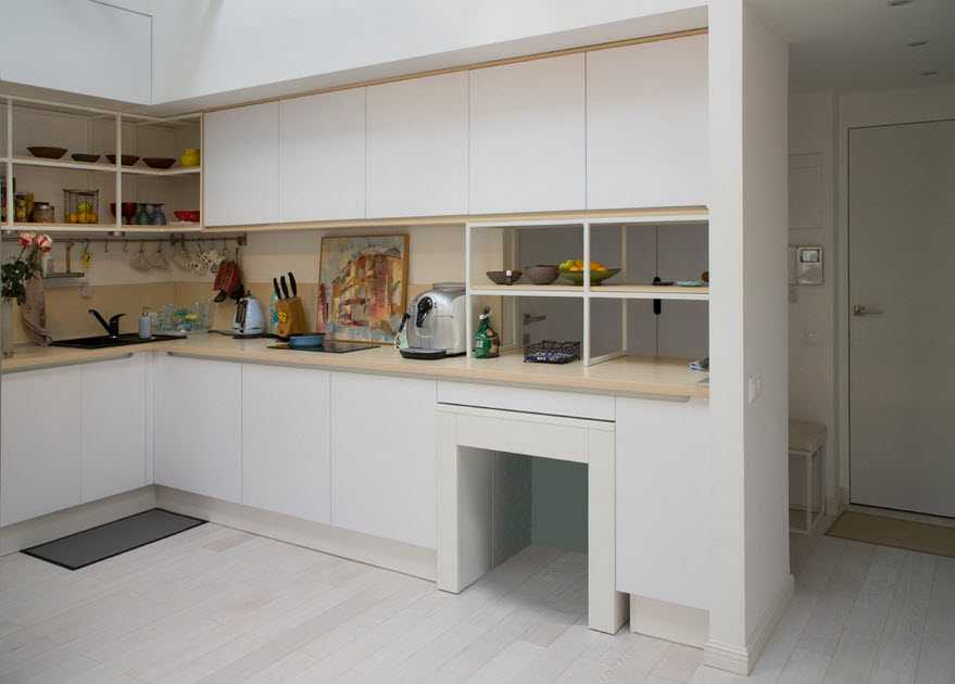Кухонный гарнитур, оснащенный выдвижным столом, который можно использовать не только как обеденное место, а и как рабочее