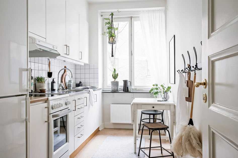На фото небольшая кухня в скандинавском стиле. Современный стол гармонично вписывается в обстановку, не имеет углов, поэтому удобен для передвижения в узких проходах.