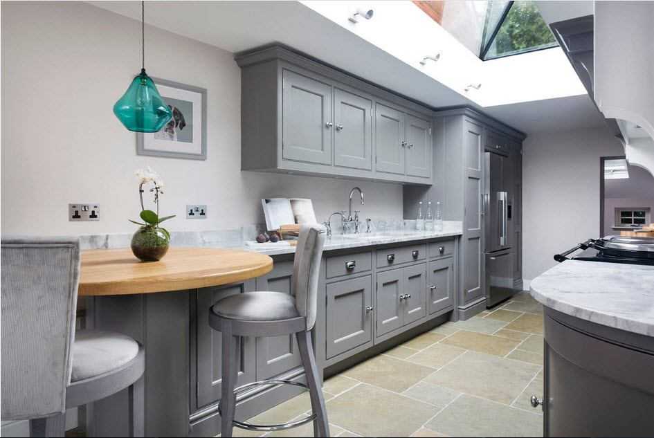 Модная лондонская кухня в серо-фиолетовой цветовой гамме с лаконичной мебелью. Круглое обеденное место оригинальной модификации – с подпоркой, являющееся продолжением кухонного острова