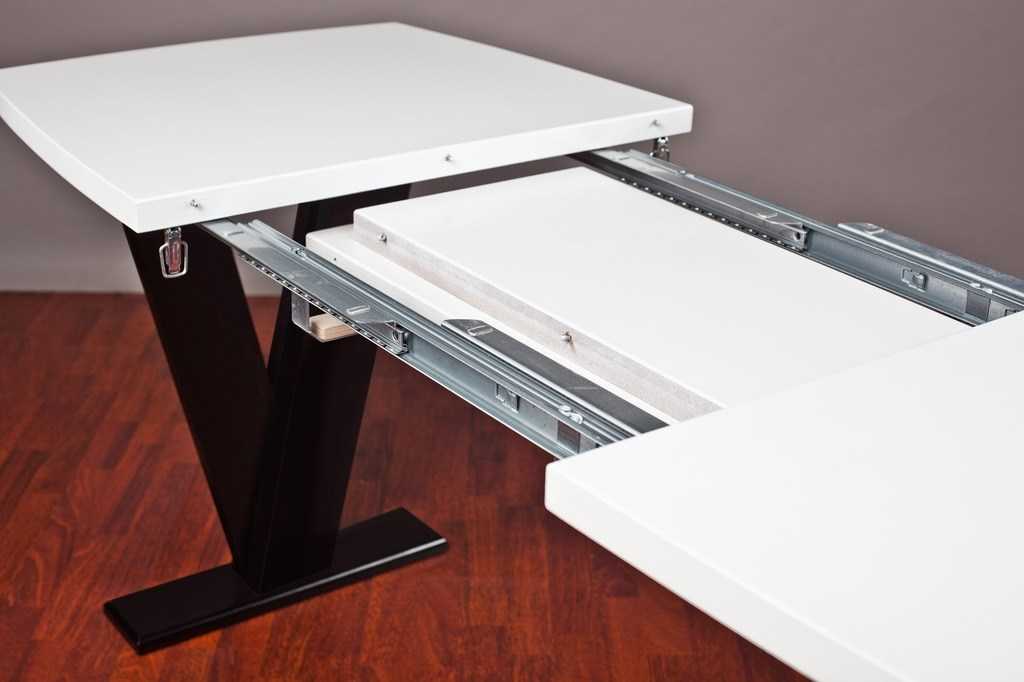 Такие модели – современны и эстетичны, они подходят для разных дизайнерских решений. Раскладывание изделия происходит посредством металлических направляющих, спрятанных под столешницей. Двигаются элементы очень легко – для их смещения достаточно слегка потянуть поверхность. Раздвижные столы из стекла не только радуют глаз, но и отличаются практичностью, так как площадь их столешницы может увеличиться до двух раз. Если поверхность становится намного больше, то модель выпускают с дополнительными опорами для большей устойчивости.