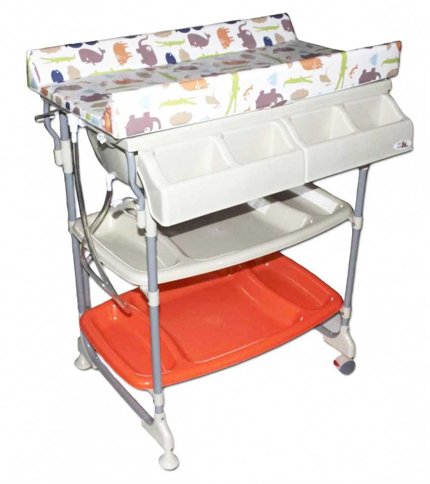 Чаще всего, это столешница из пластика, которая крепится к металлическим или деревянным ножкам, а внизу под столешницей, как правило, есть одна или две полочки. Встречаются такие модели в комплекте с ванной для купания. Изделие быстро складывается и не занимает много места, его с легкостью можно перевозить в другое место.