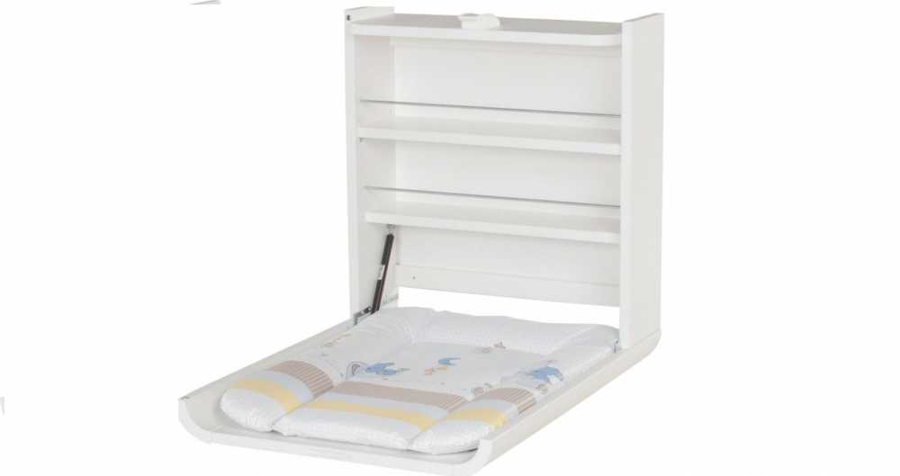 Далее, стоить рассказать о складных пеленальных столах в виде полки или шкафчика, которые подвешиваются к стене, а сама столешница опускается и поднимается (есть что-то схожее с секретером). Иногда такой пеленатор называют настенным или откидным. Как и предыдущий вариант, данная модель является отличным вариантом для небольших квартир.