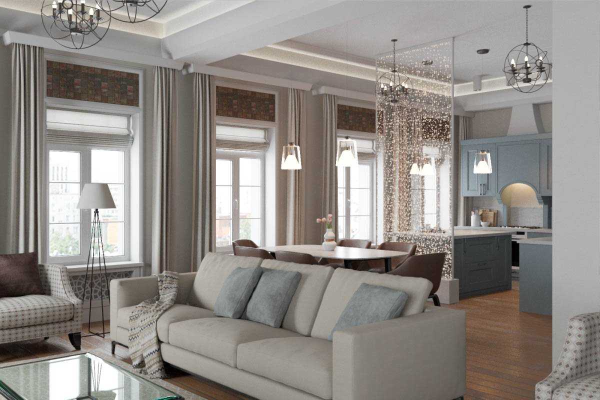 Американский стиль – отличный выбор для просторной кухни. В двухкомнатных квартирах пищеблок должен быть объединен с гостиной. Прием зонирования позволяет визуально отделить пространство готовки от обеденной зоны. Можно использовать легкие невысокие перегородки, стеллажи со сквозными полками, раздвижные панели. При желании можно просто развернуть диван спинкой к кухонной зоне. Другой вариант – отгородить его с помощью комода, на котором будут размещены комнатные растения.