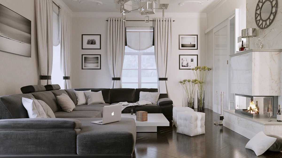 Необходимо так обустроить гостиную, чтобы она оставалась комфортной, светлой и просторной. Главная роль отводится массивной мягкой мебели, которую лучше расположить в центральной части комнаты около камина или большой телевизионной панели. Кресла и диван концентрируются вокруг миниатюрного журнального столика. Между предметами выдерживается достаточно серьезная дистанция. Вместо мягких кресел, из гарнитура могут использоваться плетеные аналоги. Технические устройства, библиотеку, декоративные элементы располагают в специально оборудованных нишах. Горизонтальные поверхности, как правило, свободны от декора и гаджетов. В интерьере недопустимо использование крупногабаритных шкафов или стеллажей.