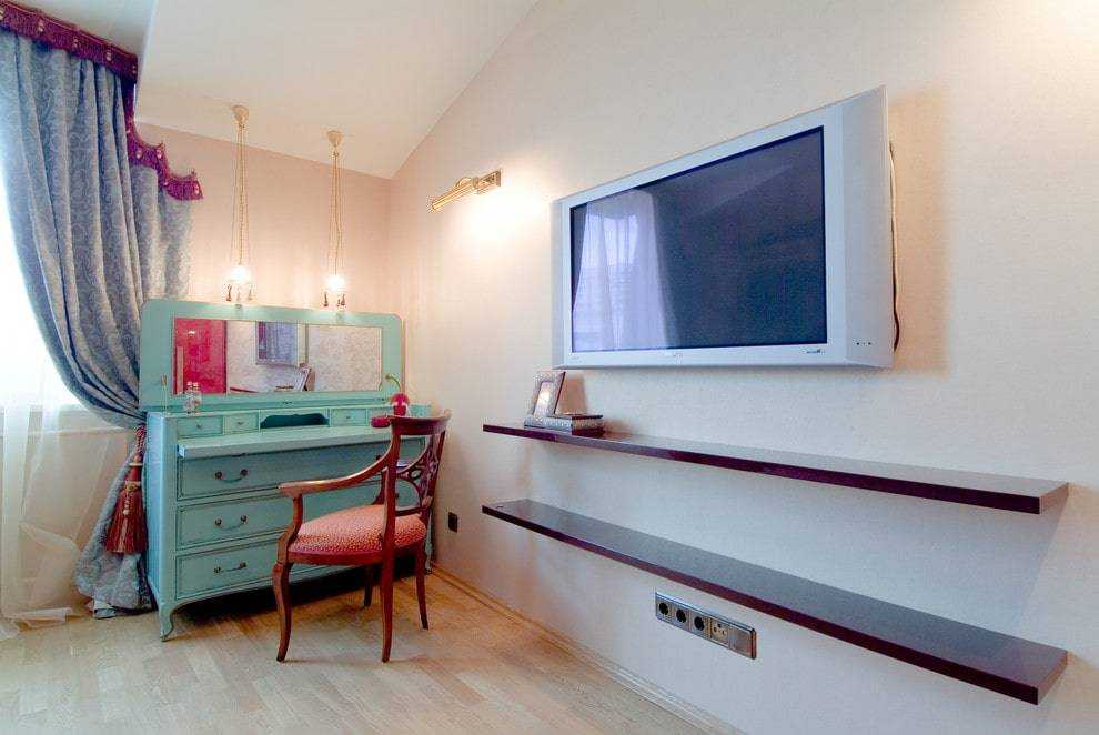 Часть дизайнеров предлагает использовать навесные полки вместо столов, чтобы сэкономить свободное пространство. Эти решения не пользуются популярностью и применяются редко. Но навесные полки часто применяются вместе с прикроватной мебелью, это помогает освободить дополнительное пространство в комнате.