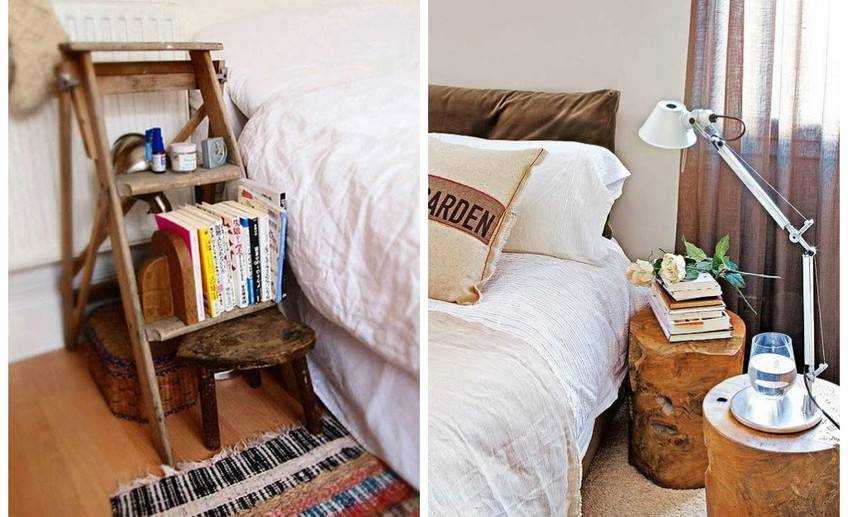 Если вы не можете выбрать прикроватную тумбочку или её цена кажется вам слишком высокой, вы можете сделать её самостоятельно в домашних условиях. Можно даже сделать маленький стол из старой кровати. Также некоторые делают прикроватные столики из пуфиков, табуреток, стульев и даже чемоданов. Старый чемодан будет смотреться очень стильно и прекрасно подойдёт для интерьера спальни в ретро-стиле. Его даже не нужно будет преобразовывать, а лишь приспособить около ложа и он будет выполнять роль прикроватного столика.