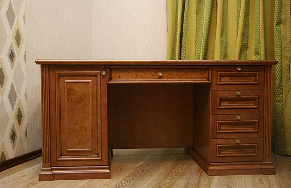 Самым подходящим будет стол кабинетный классический, сделанный из дерева, именно такие модели хорошо вписываются в любой интерьер даже небольшого кабинета.
