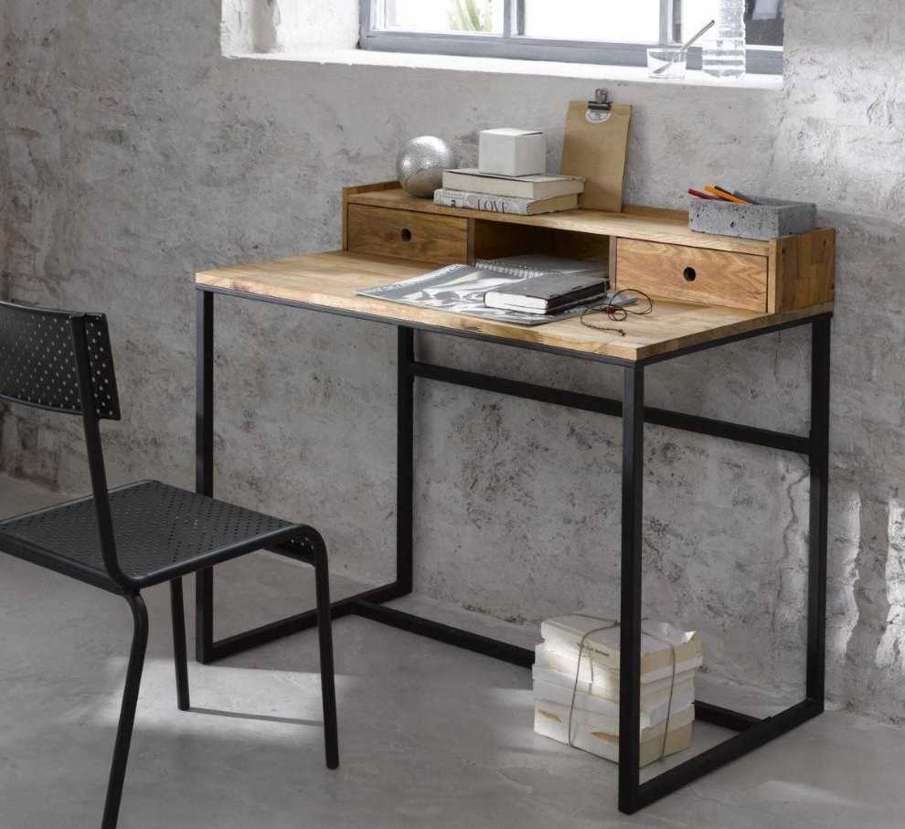 На фото письменный прямоугольный стол с деревянным основанием и металлическим кованым каркасом.