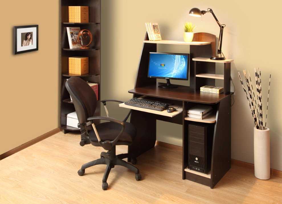 На рабочем месте с компьютером главная роль отводится оргтехнике и электронным носителям информации. Для таких целей подходит многофункциональный компьютерный стол с удобным выводом проводов и кабелей. Наличие полок под принтер, ксерокс и небольшого ящика под флешки и USB-провода дополнят конструкцию. Небольшой стол с минимальным количеством деталей подойдет для пользователей ноутбуком.