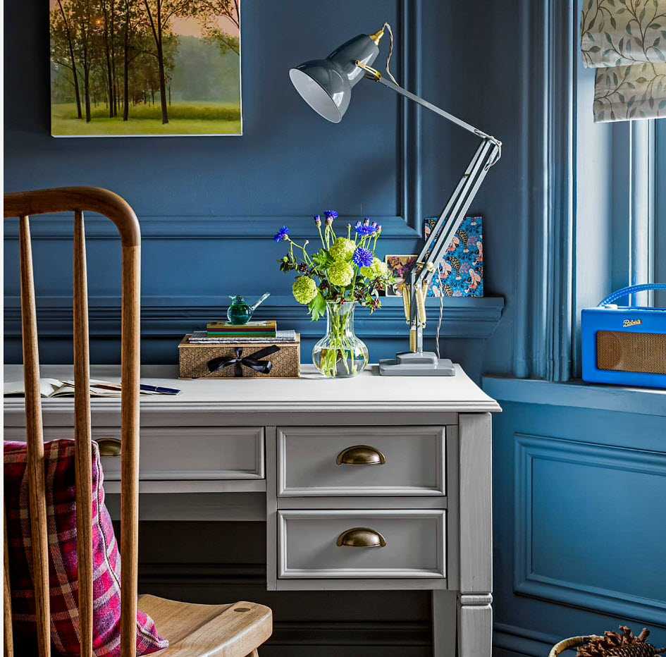 Светлый письменный стол с молдингами на ящиках – подходящий выбор для кабинета в неоклассическом стиле