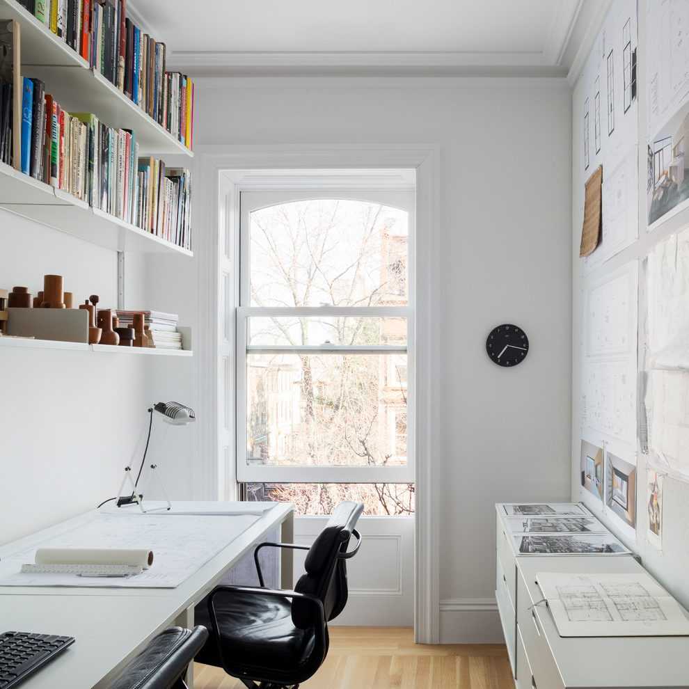 Лаконичный стол белого цвета в кабинете скандинавского стиля