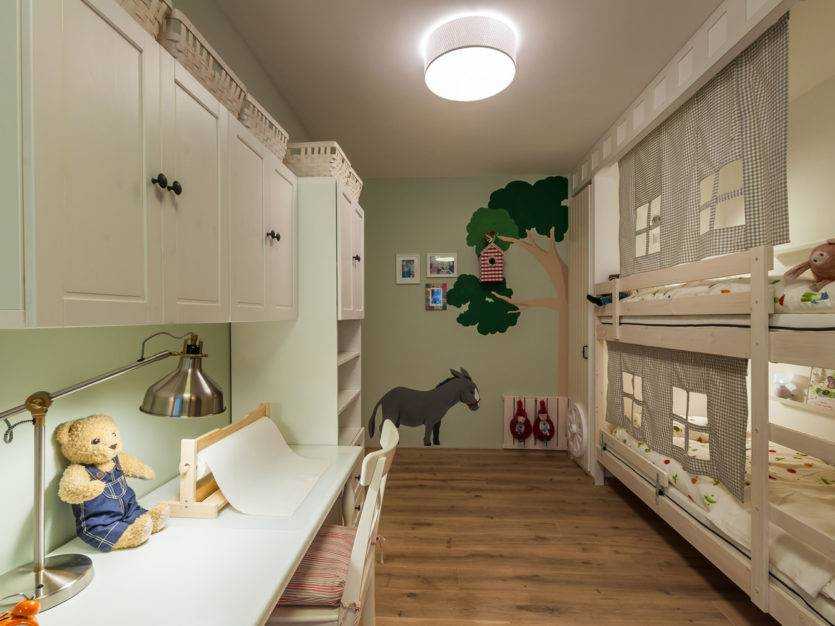 Современные технологии приходят на помощь. Многофункциональные наборы мебели с двухъярусной кроватью, блок-чердак с выдвижными секциями и другие варианты обеспечат детей спальными и рабочими местами. Помимо этого необходимо позаботиться о небольшом индивидуальном пространстве.