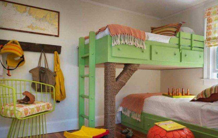 Основное внимание необходимо уделить спальной зоне, когда отличным выходом из положения станет двухъярусная кровать. Она хорошо экономит место, а двоим мальчикам будет очень интересно находиться и играть на ней