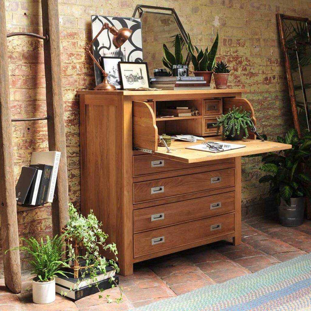 Выдвижные типы столика больше касаются комодов типа бюро. В этом случае крышка и столик это разные объекты. После поднятия крышки, можно будет выдвинуть панель стола. Это может быть небольшая столешница, закрепленная подвижно в пазах или с использованием роликовой системы. Хотя, встречаются и очень сложные варианты выдвижных столов. Некоторые модели предусматривают выдвижение не только вперед, но и вбок. Для этого используются специальные складные кронштейны с пружинами амортизаторами. При этом столик может быть совмещен со специальной откидной рамкой, играющей роль нижней опоры. Их использование и для этого типа крайне желательно.