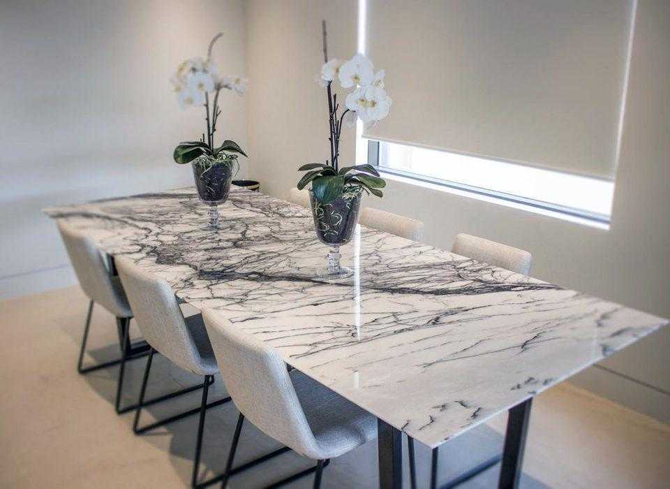 Из камня (мрамора, гранита) делают только столешницы. Они выглядят элегантно, стильно, но очень тяжелы и не слишком практичны: материал реагирует на кислоту (соки, уксус, вино), на торцах образуются сколы, поверхность покрывается царапинами. Самым долговечным считается современный вариант кварцевой столешницы, в которой присутствуют полимерные смолы.