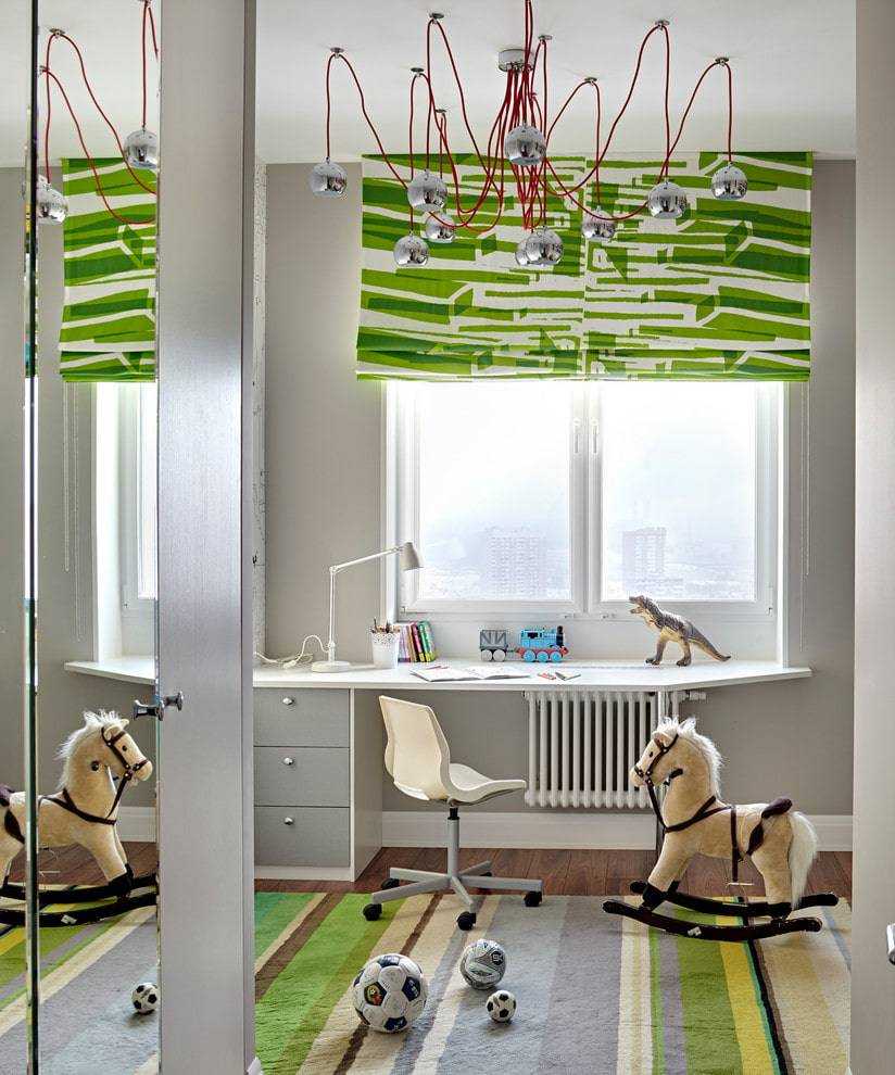 Как и в спальне, в детской можно продлить подоконник по всей стене. Во-первых, так появится большой письменный стол, который вместит несколько детей. Во-вторых, если комната принадлежит одному ребёнку, он сможет использовать это место как пространство для игр и отдыха.