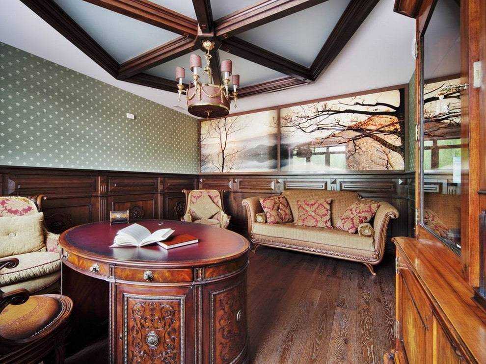 На фото кабинет и письменный маленький столик, изготовленный из дерева.