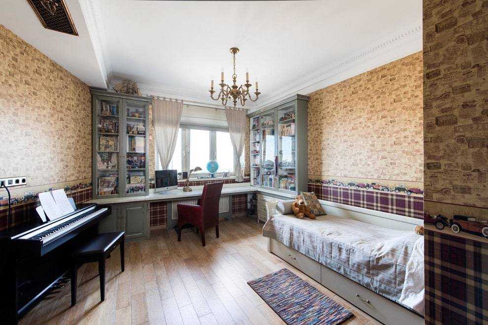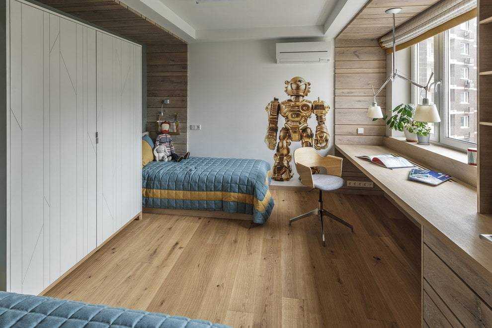 На фото интерьер детской для мальчика с письменным длинным столом, выполненным из дерева.