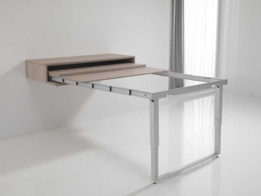 - Стол-трансформер. Самая функциональная модель, подразделяющаяся на настенные и пристенные виды. Чаще такие конструкции применяют как стол для кухни. Изделие легко сложить, что позволяет превратить его в более компактную рабочую поверхность. Среди ассортимента есть также регулируемые модели с дополнительными функциями. Для самых маленьких помещений подойдет стол настенный без опор, который крепится только специальными кронштейнами к вертикальной поверхности. В продаже можно встретить и складывающуюся разновидность с одной ножкой.