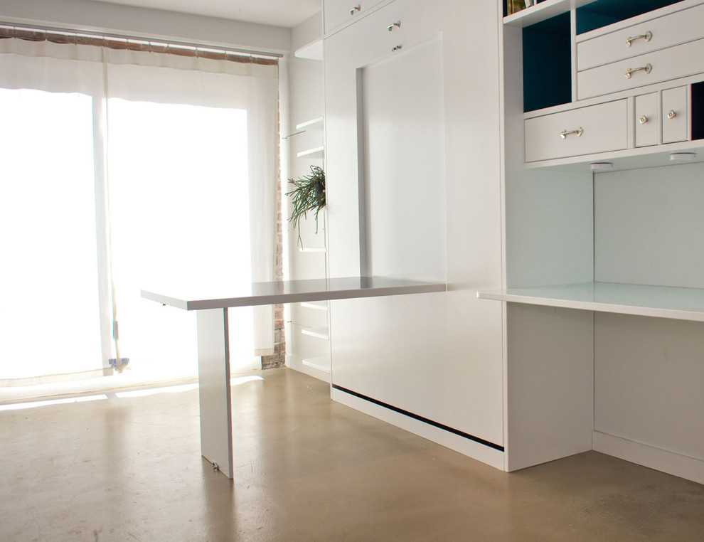 - Трансформеры. Они могут быть настенными и пристенными. Главная отличительная черта конструкции заключается в ее многофункциональности. По желанию он может превратиться в компактное рабочее место, заменив письменный стол, или же в полноценную обеденную зону.