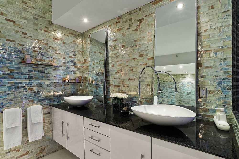 Стеклянная мозаика применяется не только в интерьере ванной, но и в помещениях другого назначения. Считается одним из древнейших материалов. Раньше была практически недоступна из-за высокой стоимости.