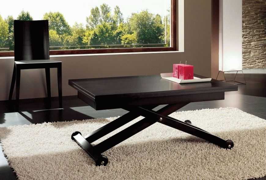 Очень стильно смотрятся столы с трансформирующимися ножками, особенно это касается футуристичных, минималистичных интерьеров и интерьеров в стиле хай-тек. Частенько у таких столиков имеются ещё и колёсики, что увеличивает их функциональность.