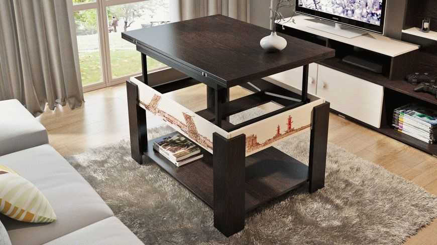 - Могут изменяться по назначению за счет наличия полифункциональной фурнитуры или консоли. Они представляют наибольший интерес, так как могут менять свои «роли» в интерьере – из журнального столика в тумбу, из тумбы – в полноценный стол для работы с бумагами. Это очень универсальный и функциональный вариант.