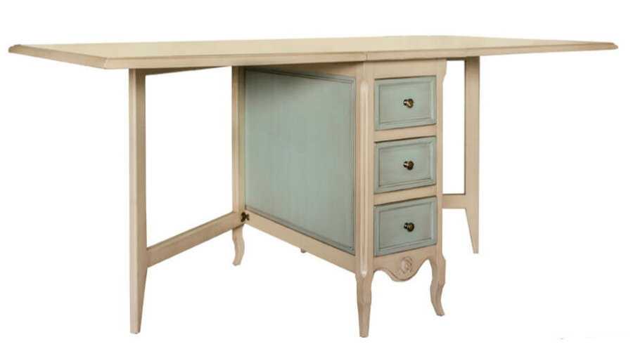 Наличие двух столешниц характеризует раскладные столы. При их использовании может функционировать одна из частей конструкции. Вариант этих столов удобен для небольших семей, состоящих из одного – двух человек. Но при появлении гостей, небольшая тумба моментально трансформируется в полноценный и вместительный стол.