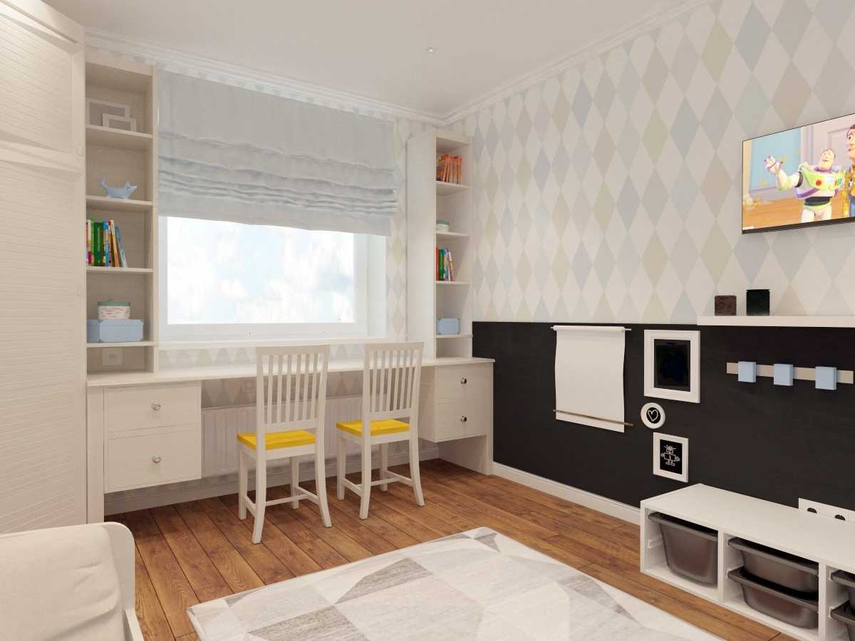 Учебную зону можно расположить по диагонали. Двухместный стол-трансформер отлично впишется в помещение площадью до 10 квадратов.