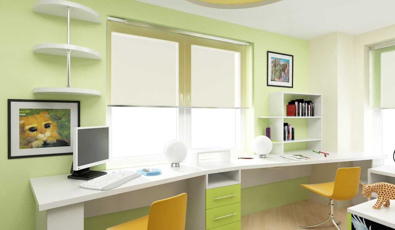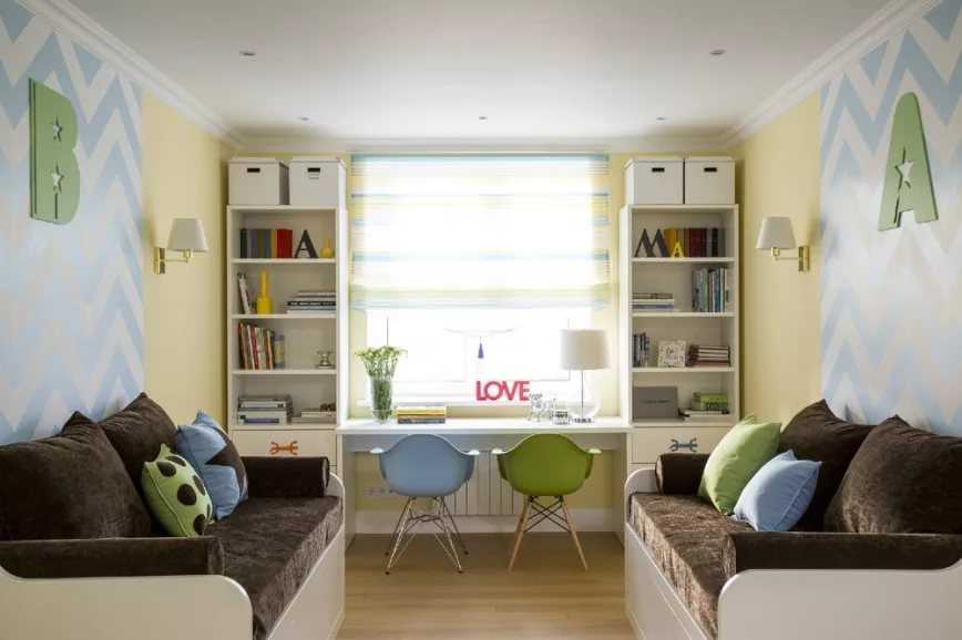 Такое расположение позволит не устанавливать подоконник, а заменить его столешницей. Рабочие места деток можно разделить тумбой или этажеркой, а навесные полочки монтировать по разным сторонам от окна.