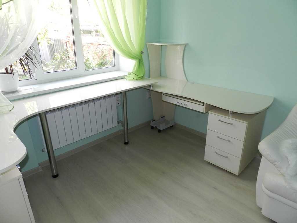 Угловое расположение экономит квадратное пространство. Стол для двух и более школьников также можно купить для комнаты с нестандартным размещением окна.