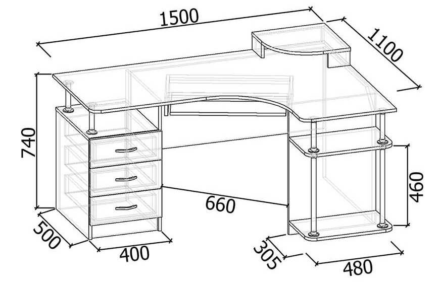 Такой стол считается очень удобным и вместительным благодаря конструкции и размерам. Основные параметры угловой взрослой модели по ГОСТу: