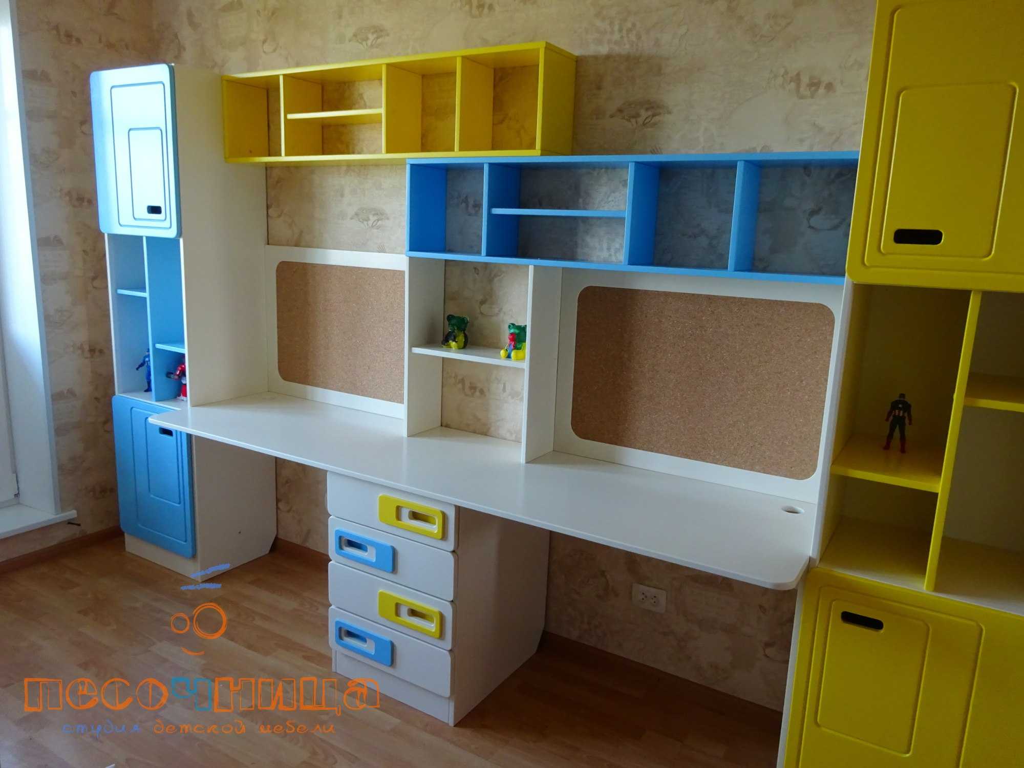 Попадается также разновидность такого двухуглового стола, у которого направленные вглубь комнаты части урезаны – тогда каждый из углов является личным компьютерным столом с надстройками и полочками для одного из малышей, а соединяющая два угла столешница – широкой общей партой.