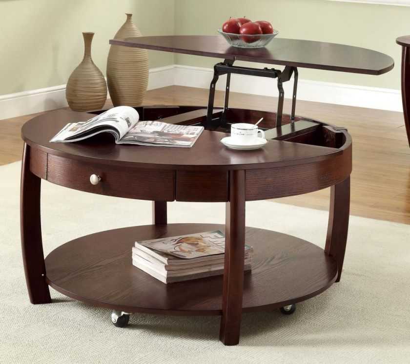 Крышка раздвижной модели состоит из двух частей. Благодаря направляющим они отодвигаются в стороны, а между ними укладывается вставка. Круглый журнальный стол приобретает овальную форму.