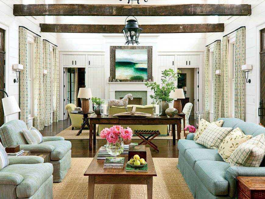 Гостиная в стиле Кантри оформляется простыми, незамысловатыми предметами мебели, из материалов преобладают древесина, плетеные изделия. Великолепно будет смотреться в прованской гостиной нарочито грубоватый столик, создающий впечатление не слишком обработанного полена. В качестве «смягчающего» декора поверхность можно обработать прутиками лозы, некрупными речными ракушками.